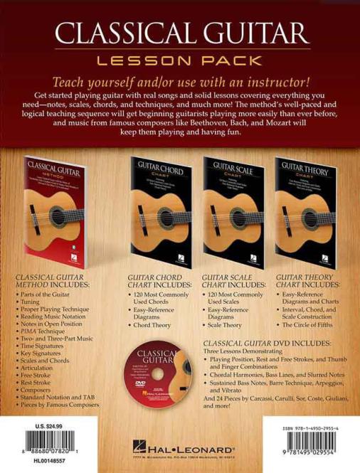 Get started playing guitar with real songs and solid lessons covering everything you need: notes, chords, scales, techniques, and much more! The method's well-paced and logical teaching sequence will get beginning guitarists playing more easily than ever before, and music from famous composers like Beethoven, Bach and Mozart will keep them playing and having fun. This boxed set includes four books (Classical Guitar Method, Guitar Chord Chart, Guitar Scale Chart, and Guitar Theory Chart) and a Classical Guitar DVD with lessons demonstrating playing position, rest and free strokes, thumb and finger combinations, chordal harmonics, bass lines, slurred notes, sustained bass notes, barre technique, arpeggios, vibrato, and more. Works for those who want to teach themselves or with a teacher!