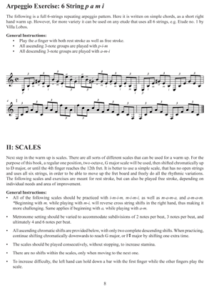 The book is divided into four sections: I Arpeggios, II Scales, III Tremolo, and IV Slurs. Each section contains a description of the exercises and general instructions on how to play them. The exercises are intended for guitarists who are looking for a simple warm-up that does not require learning many complicated Etudes, exercises or routines.