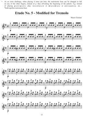 In this book, only one Etude is used for a variety of arpeggio and tremolo patterns. The scale warm-ups are based on a two-octave, one-position scale that is shifted up and down the fretboard, and a simple one-position chromatic scale. The pull-off and hammer-on slurs are combined into one exercise to save time. This same routine, when practised with the metronome gradually increasing the tempo, can also double for technical work. With the exception of one chromatic scale exercise, the rest are on closed strings. Besides being able to move the scale up and down the fretboard, the first finger can be barred. This will increase the left hand difficulty and improve the left hand position and strength.