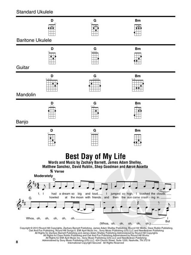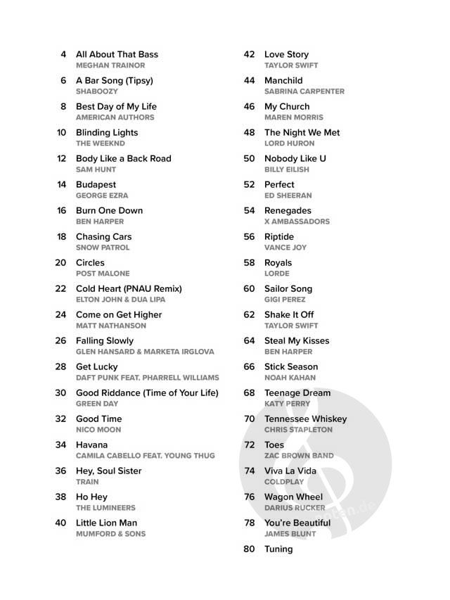 Genießen Sie es, diese aktuellen Rock-, Pop- und Country-Hits allein oder mit Ihren Freunden zu spielen und zu singen! Diese einzigartigen Sammlungen enthalten Melodie, Text und Akkorddiagramme für fünf beliebte Folkinstrumente (Ukulele, Bariton-Ukulele, Gitarre, Mandoline und Banjo). Die Arrangements sind in einem übersichtlichen Format dargestellt. Ein großartiges Hilfsmittel für Saiteninstrumentenanfänger, die den Spaß am gemeinsamen Musizieren erleben wollen. Diese Ausgabe enthält 38 Lieder, darunter: A Bar Song (Tipsy) - Best Day of My Life - Body like a Back Road - Chasing Cars - Circles - Get Lucky - Good Riddance (Time of Your Life) - Hey, Soul Sister - Ho Hey - Little Lion Man - Love Story - Manchild - My Church - The Night We Met - Riptide - Royals - Sailor Song - Steal My Kisses - Stick Season - Tennessee Whiskey - und mehr.