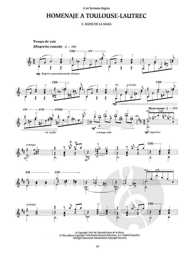 Eduardo Sainz de la Maza was both a successful guitarist and important composer. Although well known for his arrangements of Spanish folk songs, it is his original works which are seen as most significant today. His musical language is described as eclectic, combining impressionistic influences with Spanish musical traditions. Jazz was also an influence, although much of his music is described as intimate and lyrical, as depicted by Platero y yo Suiteone of the most notable compositions for the guitar of the 20th Century, within this unique collection of works.