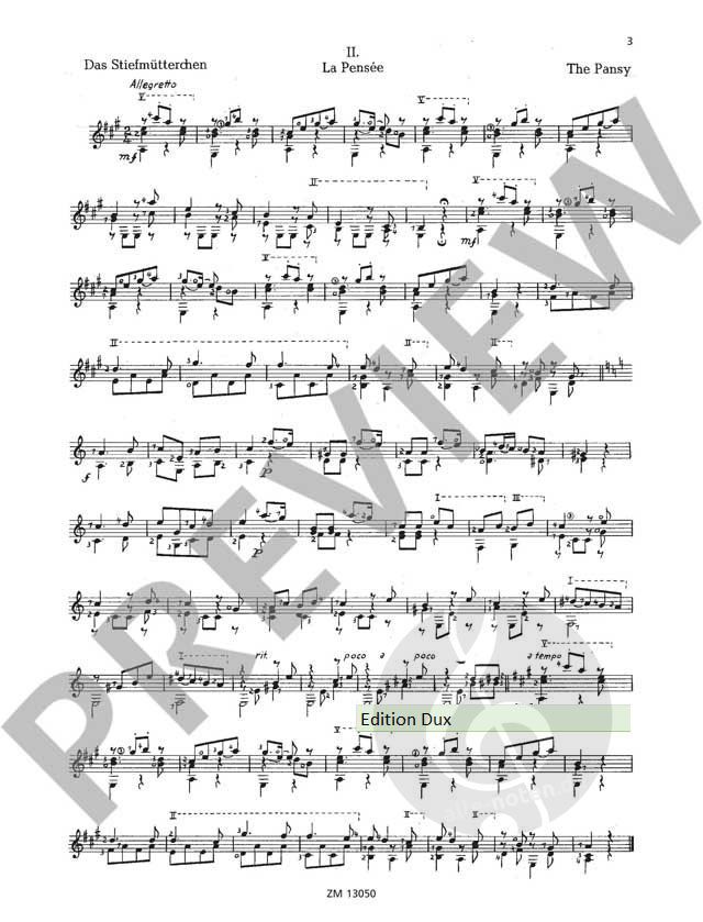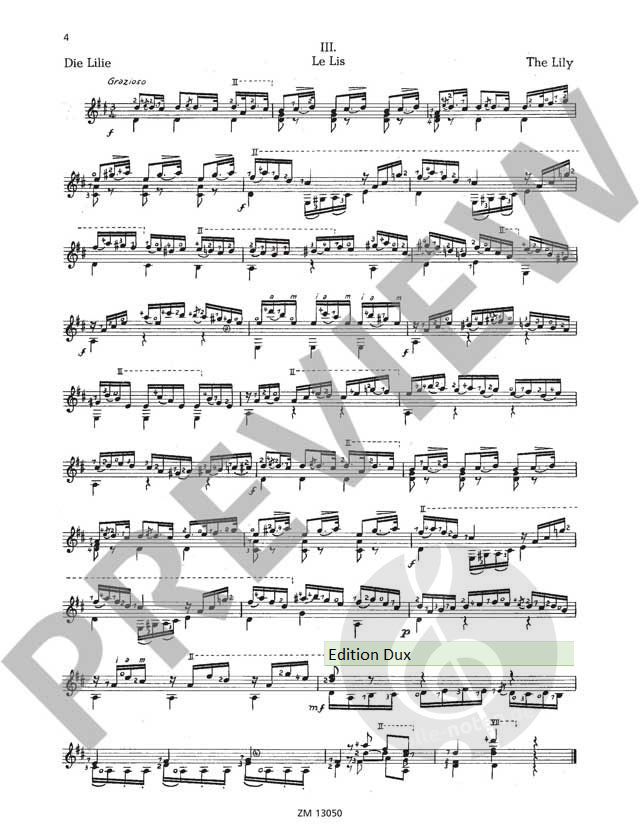 In 'Choix de mes fleurs chéries' ('Eine Auswahl meiner Lieblingsblumen') beschreibt der lange Zeit in Wien ansässige italienische Gitarrenmeister Mauro Giuliani musikalisch 10 verschiedene Blumen in 10 Stücken. Es sind reizende Biedermeierstücke, die allerdings an den Gitarristen Ansprüche stellen, so dass sie als Prüfungsstück in der Mittelstufe eingestuft werden. Erleichtert wird die Ausführung durch die exakten Fingersatz- und Lagenbezeichnungen von José de Azpiazu (1912-1986), ein bekannter Gitarrist und Komponist in der 2. Hälfte des 20. Jahrhunderts. Myrte, Stiefmütterchen, Lilie, Jasmin, Rosmarin, Narzisse, Veilchen, Rose, Lorbeer, Nelke