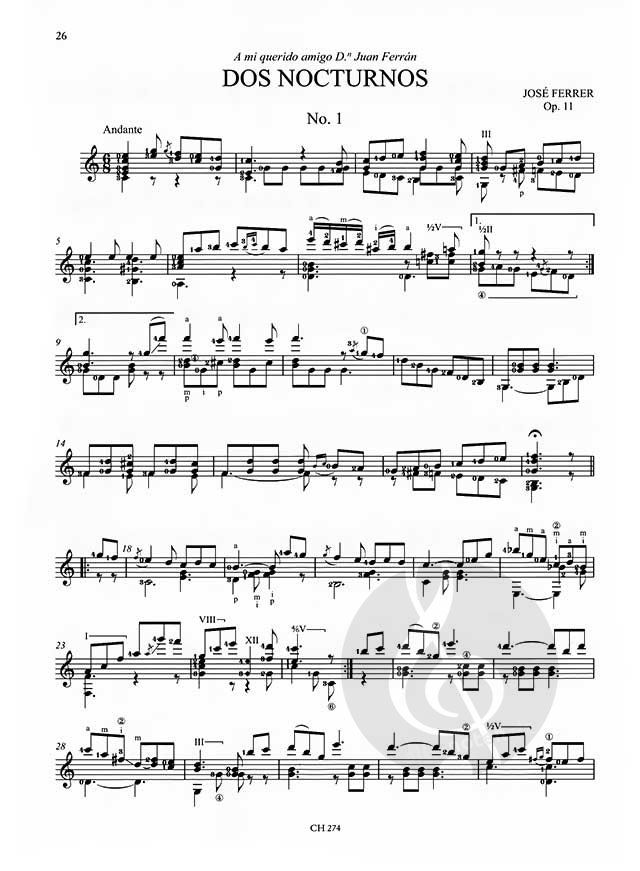 After the height of glory reached in the first decades of the nineteenth century, the guitar in Europe underwent a slow and relentless decline which distanced it from the concert halls. The music for guitar in Spain, as well as referring in style to the ancient splendours of the classical period and to the new free forms of Romanticism such as the Nocturnos, drew from the folklore heritage, offering pieces of clearly popular tradition. The selection here gathers together music by Spanish guitarists who were alive after the death of Dionisio Aguado (Madrid, 1784-1849) and who composed throughout the second half of the nineteenth century up until the beginning of the twentieth, leaving to Francisco Tárrega (Villareal, Castellón, 1852 - Barcellona, 1909), the task of finally restoring to the guitar the role it once had.