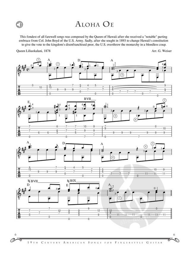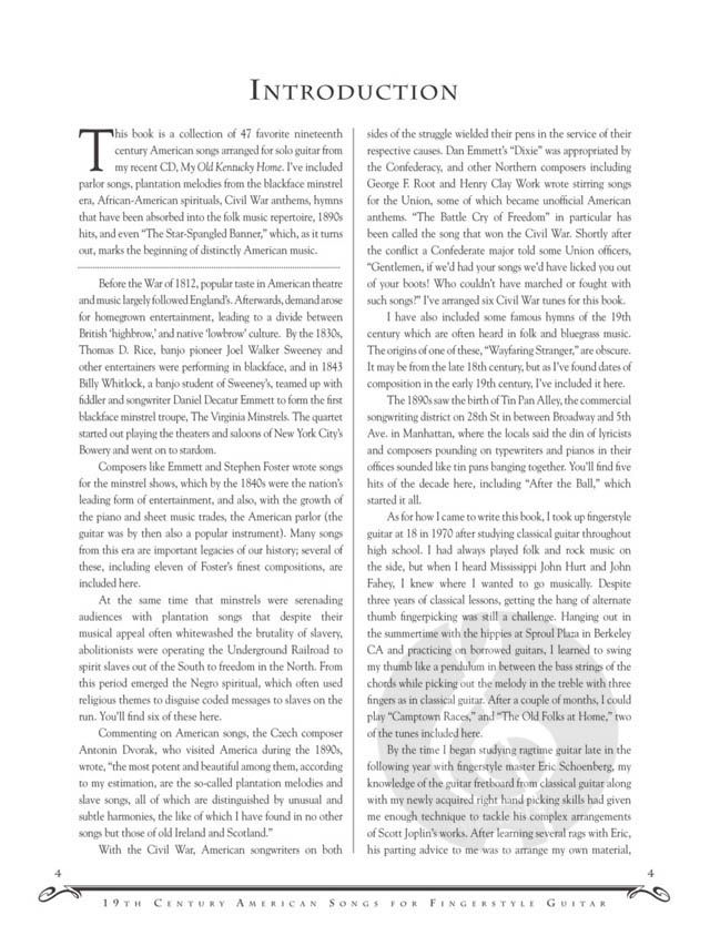 This is a colleciton of 47 favorite 19th century American songs arranged for fingerstyle guitar from Glenn Weiser's recent CD, My Old Kentucky Home. Here you'll find Stephen Foster's famous compositions and other parlor songs, African-American spirituals, Civil War anthems, familiar hymns and 1890s hits. These priceless legacies of our national heritage form much of the soundtrack of American history: Oh! Susanna was on the lips of every Forty-Niner during the California Gold Rush, Harriet Tubman sang Swing Low, Sweet Chariot, on her deathbed, and Abraham Lincoln wept the first time he heard The Battle Hymn of the Replublic. Now guitarists can play these and many more in new, beautiful solo arrangements.