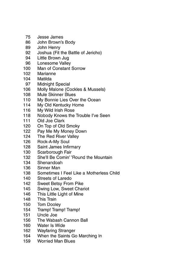 A strummer's cornucopia of 80 folk favorites! Includes lyrics and chords for: Au Clair De La Lune * Aura Lee * Banks of the Ohio * Beautiful Dreamer * Bury Me Beneath the Willow * Camptown Races * Deep River * Dixie * Frankie and Johnny * Git Along, Little Dogies * Home on the Range * Hush, Little Baby * I've Been Working on the Railroad * I've Got Peace like a River * John Henry * Lonesome Valley * Man of Constant Sorrow * Mule Skinner Blues * My Old Kentucky Home * Nobody Knows the Trouble I've Seen * Scarborough Fair * When the Saints Go Marching In * more.