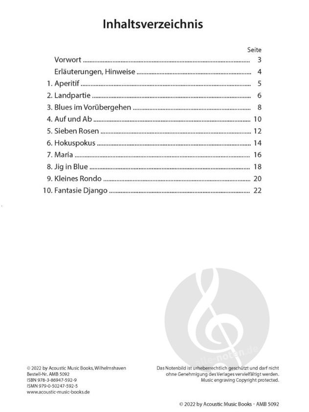 Der Band enthält einen Blues, einen Walzer, eine Jig und sechs melodiöse Charakterstücke, die als Soli wirkungsvoll vorgetragen werden können. Ein Duett mit Improvisationsteil setzt noch einen besonderen Akzent. Mit dem angegebenen Schwierigkeitsgrad eignen sie sich sowohl für den Gitarrenunterricht als auch für das Selbststudium.