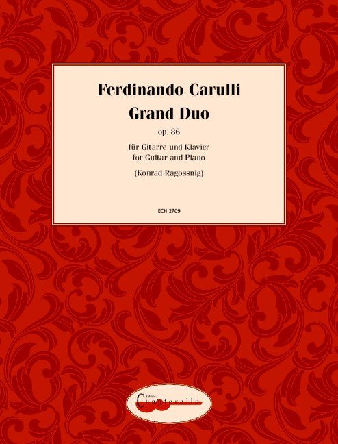 Carullis Musik spricht im Allgemeinen eine einfache, aber charmante Sprache. Das Grand Duo op. 86 für Gitarre und Klavier ist ein hervorragendes Konzertwerk und eine wertvolle und bedeutende Erweiterung des Gitarrenrepertoires. Obwohl es eine sichere Technik erfordert, ist es für Spieler mit mittleren Fähigkeiten geeignet. Diese Ausgabe wurde von dem renommierten österreichischen Gitarristen Konrad Ragossnig herausgegeben.