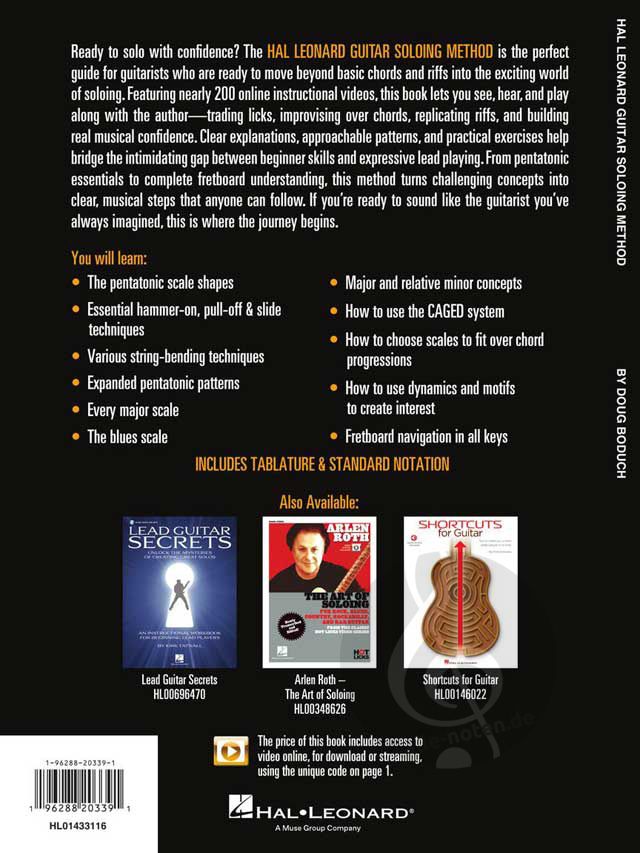 Sind Sie bereit, mit Selbstvertrauen zu solieren? "The Hal Leonard Guitar Soloing Method" ist der perfekte Leitfaden für Gitarristen, die bereit sind, über grundlegende Akkorde und Riffs hinaus in die aufregende Welt des Solospiels einzusteigen. Mit fast 200 Online-Lehrvideos können Sie in diesem Buch sehen, hören und mit dem Autor zusammen spielen - Licks tauschen, über Akkorde improvisieren, Riffs nachspielen und echtes musikalisches Selbstvertrauen aufbauen. Klare Erklärungen, leicht verständliche Patterns und praktische Übungen helfen, die einschüchternde Kluft zwischen Anfängerwissen und ausdrucksstarkem Lead-Spiel zu überbrücken. Von den Grundlagen der Pentatonik bis hin zum vollständigen Verständnis des Griffbretts macht diese Methode aus schwierigen Konzepten klare, musikalische Schritte, denen jeder folgen kann. Wenn Sie bereit sind, wie der Gitarrist zu klingen, den Sie sich immer vorgestellt haben, dann ist dies der Ort, an dem die Reise beginnt.