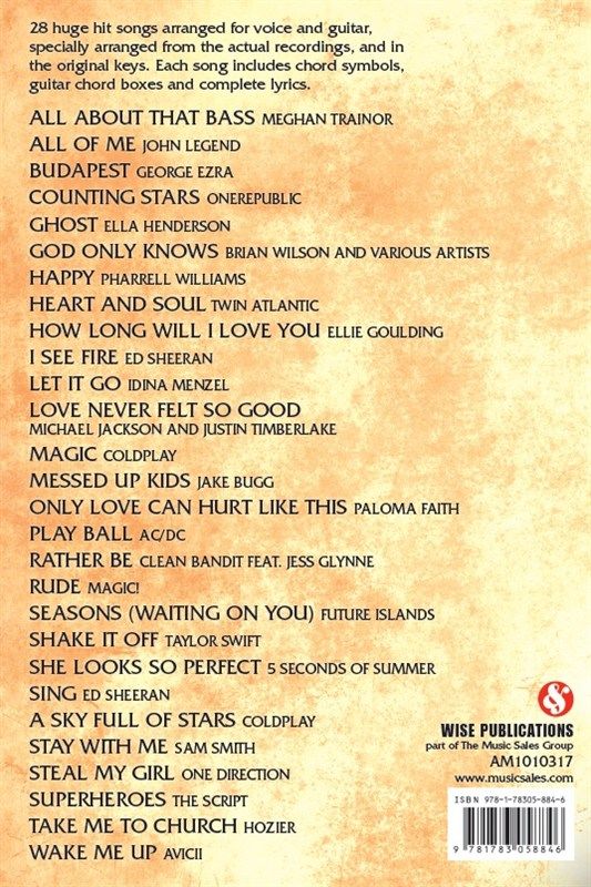 The Hits Of The Year: Guitar Chord Songbook contains 28 of the biggest, most popular hit songs of the past year, arranged for Voice and Guitar from the actual recordings and in the original keys. If you have been on planet Earth throughout 2014, you will have been exposed to the cream of the crop of hits from today's biggest artists. Old favourites like AC/DC and The Beach Boys have justifiably come back into the people's hearts, while newcomers like George Ezra, Ella Henderson and Meghan Trainor have proved that creativity is constantly blossoming among the younger generation. This Hits Of The Year songbook features such innovative tracks like Rather Be by Clean Bandit, hugely popular party songs like Taylor Swift's Shake It Off and infectiously catchy tracks like Happy by Pharrell Williams. Each track includes full lyrics and accurate Guitar chord symbols and chord boxes, so that you can quickly pick up and play all of the year's best songs. When you start singing and playing any of these tunes, your friends and family will be amazed that you have mastered such new and popular tracks that they will be so familiar with. Learning songs like the smash-hit Let It Go or Sam Smith's Stay With Me will be a breeze, and there is such fantastic variety here that you will never be short of a powerful pop melody to learn and perform. For fans of the biggest chart hits, or just admirers of brilliant and catchy songwriting, the Hits Of The Year: Guitar Chord Songbook, is a perfect collection of the biggest contemporary tunes.