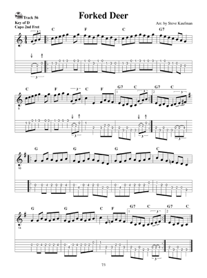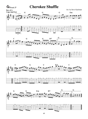 This collection of fiddle tunes originally appeared in 'Kaufman's Collection of American Fiddle Tunes for Flatpicking Guitar. Steve Kaufman says he can't emphasize enough the importance of developing a large repertoire of tunes. Fiddle tunes give us melodies that eventually allow us to begin to improvise. Sometimes without even knowing it. The more tunes you know, the more melodies and intersecting melody lines you know. This allows you to eventually cut and paste portions of the melody line into another song. In the beginning you will probably unknowingly replace an ending run. These are the last two measures of the section of a tune. Many of them in the same key areinterchangeable, unless they are specific to the melody of the song. After a while you will cut out measures in the middle of the song and then you will be able to take the snips of melodies and play them in another song in a different key thus beginning to improvise. All of this is possible because you built up your repertoire of tunes. Includes access to online audio.