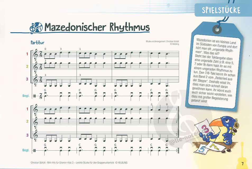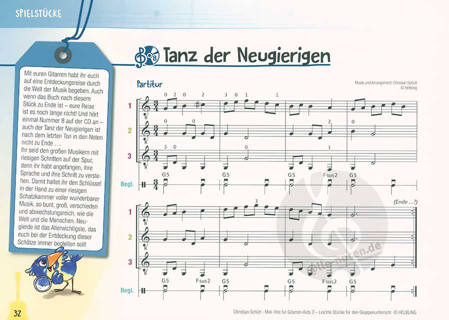 Die 'Mini-Hits für Gitarren-Kids 3' ergänzen die ersten beiden Bände der Reihe um neue mehrstimmige Stücke, Improvisationen und Kanons. Neue Töne (erstmals mit Vorzeichen) und Akkorde erweitern die Kenntnisse der Kinder, eine Differenzierung innerhalb der Gitarrengruppe ist jedoch durch den pädagogisch durchdachten Aufbau des Hefts weiterhin problemlos möglich.
