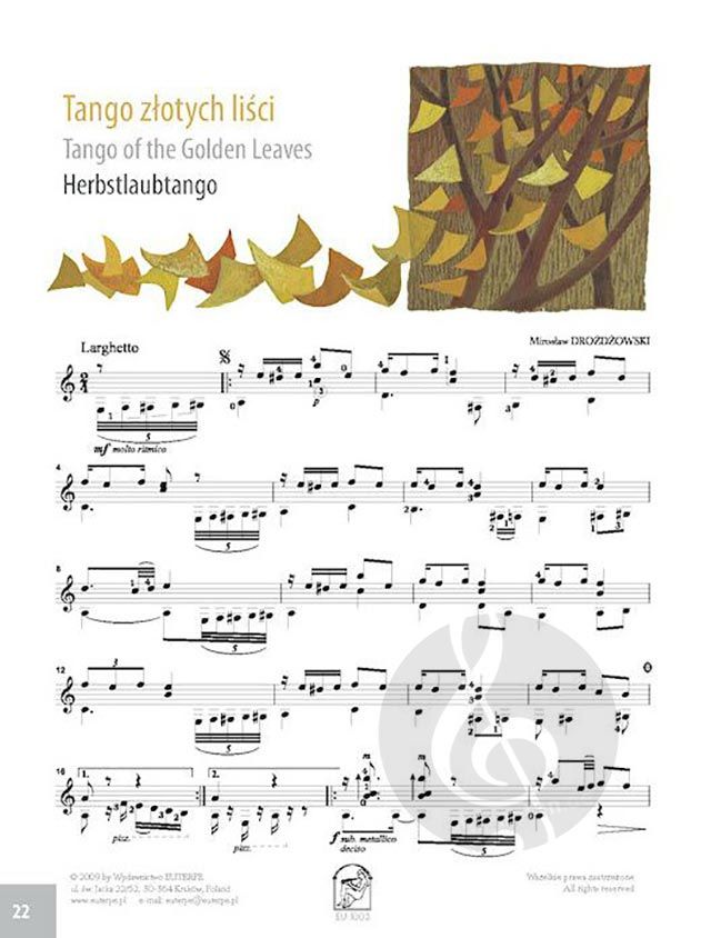 This collection is aimed at beginners and intermediate guitarists. It contains pieces covering a variety of styles: from joyful ragtime and striking blues, to romantic waltzes, melodious ballades, and miniatures maintained in the Latin American style. The common feature of these compositions is the melody, the clear harmony, the transparent invoice, the clear form, and the level of difficulty - which has been maintained throughout. The effects and guitar techniques applied in the songs, i.e. rasgueado, pizzicato, flageolets, tremolo, tapping the guitar body, enabled to highlight the richness of the colour and verbal abilities of this instrument. The works have been organised into four groups associated with the seasons of the year. This is why the album starts with a few 'spring' miniatures; next the 'hot rhythms of the summer', then the 'autumn impressions', full of reverie and nostalgia, and lastly compositions which conjure up 'winter images'.