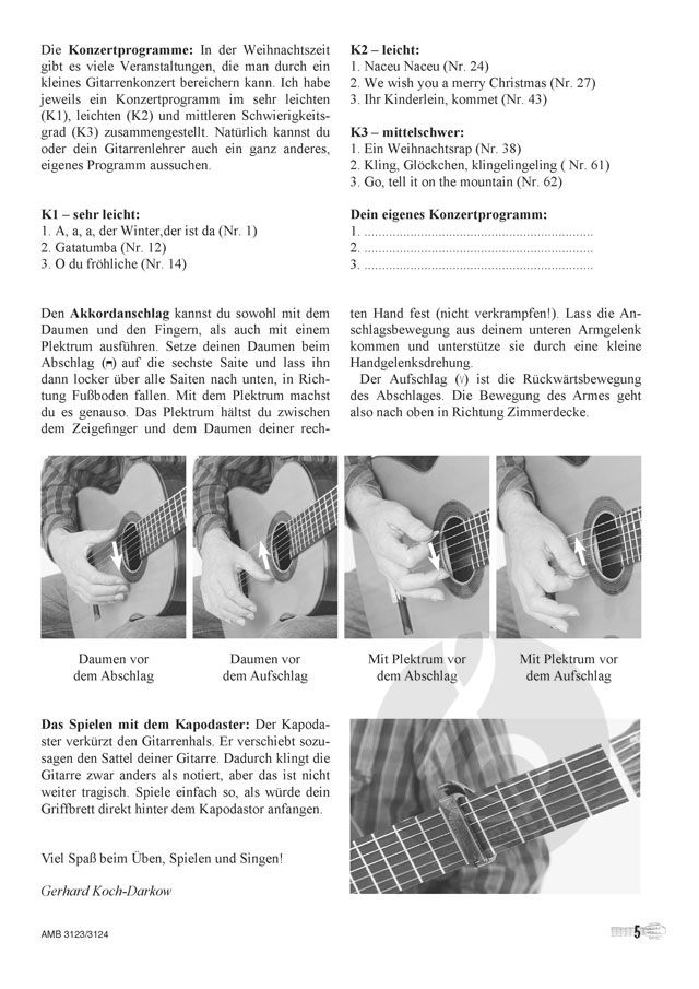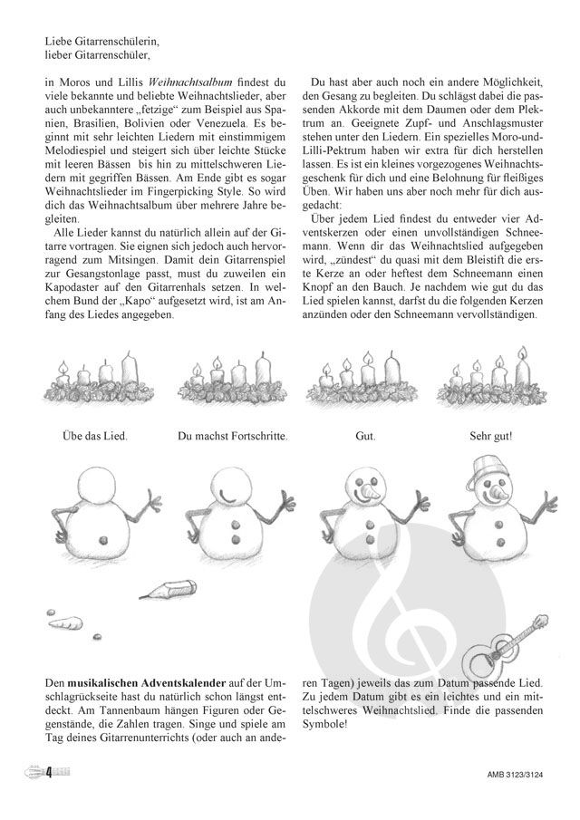 Ganz gleich ob Anfänger oder Fortgeschrittener - das Weihnachtsalbum hält für jeden Gitarrenschüler passende Lieder bereit und begleitet ihn über mehrere Jahre. Neben den beliebtesten Weihnachtsliedern stehen hierzulande unbekannte, 'fetzige' Lieder aus Spanien, Finnland, Brasilien, Mexiko, Bolivien und Venezuela. Sie beleben das vorweihnachtliche Musizieren und bieten Schülern wie Lehrern willkommene Abwechslung. - Moro und Lilli sind die Leitfiguren unserer beliebten, gleichnamigen Kindergitarrenschule.