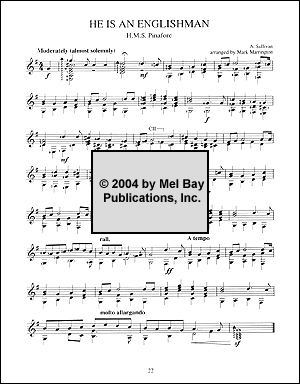 This anthology contains nineteen of the most popular Gilbert and Sullivan classics arranged in easily sight-readable versions for beginning to intermediate classical guitarists. All the favorites are here, ranging from sentimental ballads such as 'Little Buttercup', 'Willow, Tit-Willow' and 'There Grew a Little Flower', to more up-tempo 'patter' type pieces such as 'Oh! A Private Buffoon', 'Kind Sir You Cannot Have the Heart' and 'A Policeman's Lot'. The aim has been to provide both a useful teaching resource and a light-hearted alternative to the more 'serious' music of the classical guitar repertoire. All the pieces lend themselves extremely well to the common idiomatic textures of the classical guitar. A variety of melody and accompaniment styles are employed, including block chords, arpeggio patterns and passages of double-stopped thirds and sixths. A number of the pieces are in easy first position format, while others explore the common higher positions. The standard guitar keys are utilized (C, G, D, A, E) but there are occasional more challenging temporary modulations to 'difficult' keys, such as E flat major. There are also instances of drop-D tuning, which is often required in classical guitar playing.