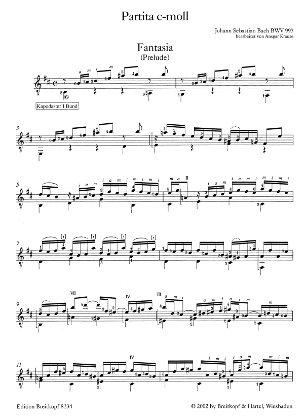 Wenn der Interpret und Pädagoge Ansgar Krause sich Bachs Lautenwerk annähert und mit den beiden Heften EB 8234 und 8235 seine Bach-Edition abschliesst, dann geschieht dies vor allem mit Blick auf die überzeugende Umsetzung des Originals. Krause lehnt bei der 'Partita' BWV 997 (der gängige Werktitel 'Suite' ist stilistisch problematisch) das gängige a-moll ab, lässt das satztechnisch überzeugendere h-moll greifen bzw. (mit Kapodaster) das originale c-moll erklingen. Auch die bei Bach oft mehrschichtige Überlieferung wird genutzt: für die Fuge BWV 1000 liefert stellenweise Bachs eigene Bearbeitungstechnik (für Orgel in BWV 539) gitarrengerechte Lösungen.