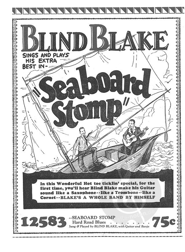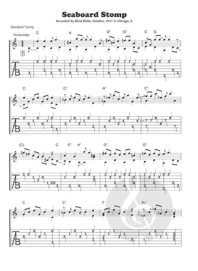 Blind Blake was the greatest ragtime blues guitarist to record during the 1920s. His intricate fingerpicking sounded more like a ragtime piano than an actual guitar. It captured the pulsating rhythms of the blues, ragtime, and jazz music of the period. Rev. Gary Davis admired Blake’s playing and said: “I ain’t never heard anybody on a record yet beat Blind Blake on guitar. I like Blake because he played right sporty.”In 1926 Blind Arthur Blake signed for ‘Ink’ Williams of Paramount Records in Chicago. His first release was the amazing instrumental West Coast Blues. The record was a hit and ‘Ink’ kept him busy in the studio for the next six years. He was a first-call session player for all the Paramount stars and featured on records by Papa Charlie Jackson, Ma Rainey, Gus Cannon and Ida Cox, among many others. He recorded over 80 titles as a solo artist. It was his instrumental numbers, Blind Arthur’s Breakdown, Come on Boys Let’s Do That Messin’ Around and Southern Rag that singled out Blind Blake as a truly unique talent who set a standard that other stars of Piedmont style Blues could only aspire to.Modern fingerstyle guitarists such as Jorma Kaukonen, Ry Cooder, David Bromberg, Leon Redbone, Dave Van Ronk, Paul Geremia and Ari Eisinger, have all recorded Blind Blake songs i.e. Too Tight Rag, Diddie Wa Diddie, Police Dog Blues, Tootie Blues, That Will Never Happen No More, Chump Man Blues and Righteous Blues. These tunes have all become staples of today’s acoustic blues scene.Blake’s ragtime guitar arrangements are both a challenge to play as well as transcribe. They are for confident fingerstyle guitarists. This collection presents a mixture of 17 rags, stomps and songs that will keep your fingers very busy. Also included are downloads of the original Paramount recordings. We have also added downloads of the song recordings without the vocals courtesy of https://vocalremover.org/. These downloads will be of great help in hearing what Blake plays behind his singing.Titles include SONGS Too Tight Blues No.2, That Will Never Happen No More, Playing Policy Blues, Hey Hey Daddy Blues, He’s In The Jailhouse Now, Diddie Wa Diddie, Georgia Bound, Down The Country, Police Dog Blues, Sweet Jivin’ Mama RAGS & STOMPS Wabash Rag, Blind Arthur’s Breakdown, West Coast Blues, Seaboard Stomp, Southern Rag, Dry Bone Shuffle, Come On Boys Let’s Do That Messin’ Around