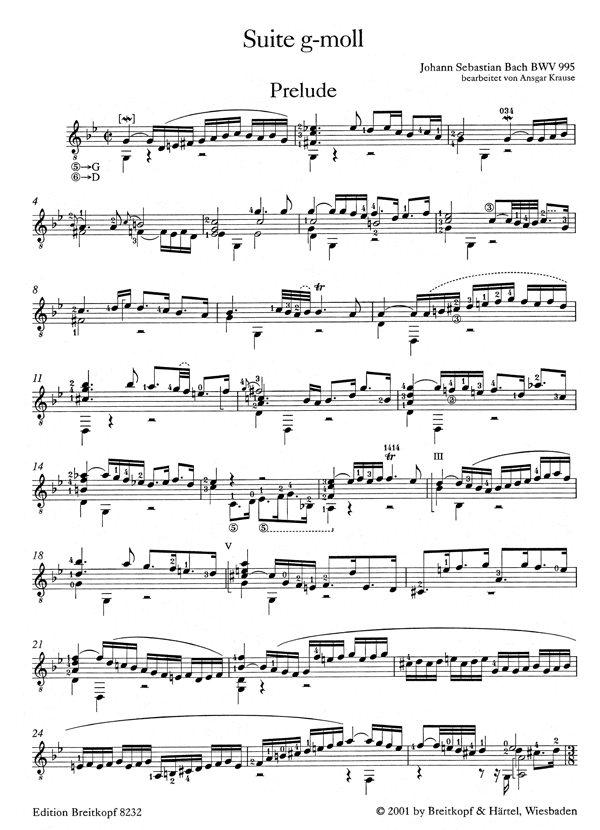 Der Gitarrist Ansgar Krause ist inzwischen ein erfahrener Bach-Interpret und versierter -Bearbeiter, wie zahlreiche Ausgaben im Katalog 'Edition Breitkopf' belegen. In seinem Vorwort zur Suite BWV 995 begründet Krause mit triftigen Argumenten die Wahl der Tonart g-moll, mit der sich seine Version von den gängigen Gitarren-Einrichtungen, die meist in a-moll stehen, unterscheidet. Krause, der seine Bearbeitungen selbst im Konzert erprobt und auf CD eingespielt hat, gelingt so eine Annäherung an Bachs Violoncello-Satz, der der Lautenfassung eigentlich zu Grunde liegt.