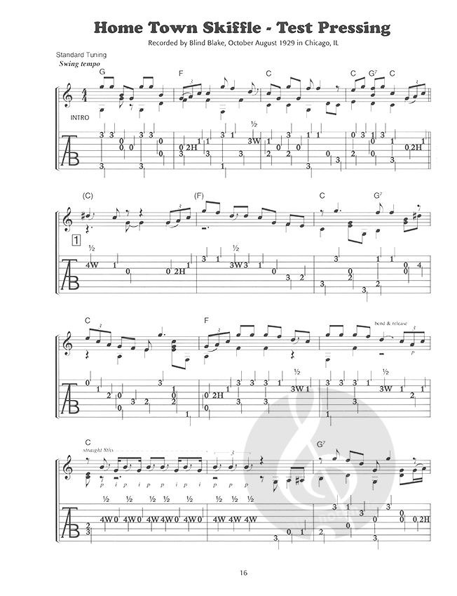 Blind Blake was the greatest ragtime blues guitarist to record during the 1920s. His guitar playing was unique. It captured the pulsating rhythms of the blues, ragtime, and jazz music of the period. Rev. Gary Davis went as far as to say: “I ain’t never heard anybody on a record yet beat Blind Blake on guitar. I like Blake because he played right sporty.”Modern fingerstyle guitarists such as Jorma Kaukonen, Ry Cooder, David Bromberg, Leon Redbone, Dave Van Ronk, Paul Geremia and Ari Eisinger, have all recorded Blind Blake songs i.e., Too Tight Rag, Diddie Wa Diddie, Police Dog Blues, Tootie Blues, That Will Never Happen No More, Chump Man Blues and Righteous Blues. These have all become staples of today’s acoustic blues scene.Blake’s guitar arrangements are both a challenge to play as well as transcribe. This collection presents 26 blues that will keep your fingers very busy. Also included are downloads of the original Paramount recordings. In some cases, there exists only one copy of a recording and this might be in worn-out shape. The results present a combination of incredible guitar playing intertwined with static surface noise. We have also added downloads of these recordings without the vocals courtesy of vocalremover.org. These downloads will be of great help in hearing what Blake plays behind his singing.Titles include: Key of C Home Town Skiffle, Leavin’ Gal Blues, Guitar Chimes, Righteous Blues, Ice Man Blues, Early Morning Blues, Black Dog Blues, Goodbye Mama Moan, Baby Lou Blues, Walkin’ Across the Country, Tootie Blues, Rope Stretchin’ Blues/Part One, That Lonesome Rave, Worried Blues, What a Lowdown Place the Jailhouse Is Key of G Cold Hearted Mama, Hard Road Blues, Tampa Bound, Steel Mill Blues, Stonewall Street Blues, Wilson Dam, Night & Day Blues Key of D Back Biting Blues, Chump Man Blues Key of A Sun to Sun, One Time Blues