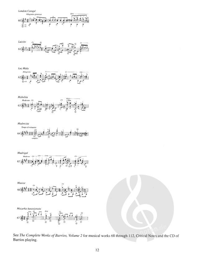 The product of decades of scholarly investigation, Volume 1 contains 67 musical works by the virtuoso Paraguayan guitarist Agustín Barrios Mangoré (1885-1944). This is the first edition of Barrios' music based on all available sources: manuscripts, phonograph recordings and published editions (pre-1970s). Written in standard notation only, the two volumes of this definitive collection are illustrated with period photographs, concert programs and Barrios' own drawings. The legacy of Barrios is one of the most important and outstanding contributions ever made to the classic guitar, and it is with great pride that Mel Bay Publications offers here for the first time in one edition the collected works of Agustín Barrios Mangoré.