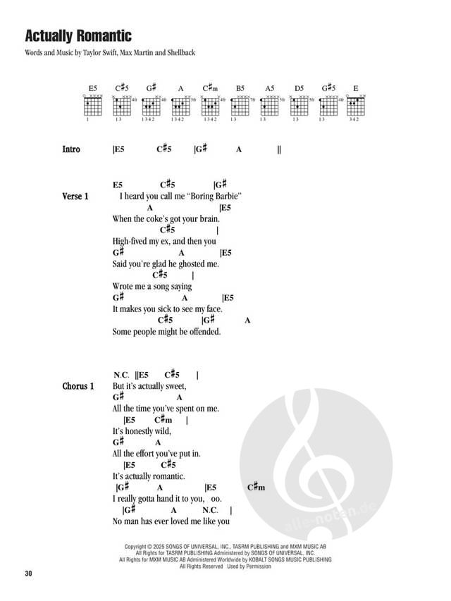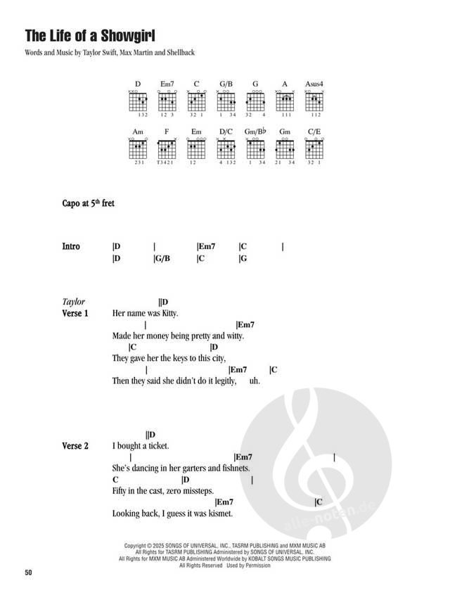 Erlebe deine Showgirl-Ära! Von den Songs, die dir das Herz brechen, bis zu denen, die du immer wieder hören wirst, kannst du jeden Moment von Taylors neuester Veröffentlichung Life of a Showgirl spielen oder singen. Diese Sammlung enthält alle zwölf Popsongs, arrangiert mit Gitarrenakkorden und vollständigen Texten. Treten Sie ins Rampenlicht und holen Sie sich den Glamour nach Hause mit diesen unvergesslichen Songs: Tatsächlich romantisch - Abgesagt! - Eldest Daughter - Elizabeth Taylor - Father Figure - Honey - Opalite - Ruin the Friendship - The Fate of Ophelia - The Life of a Showgirl - Wi$h Li$t - Wood. Dein Spotlight wartet.
