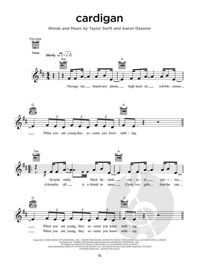 15 of 2020's biggest chart hits so far, specially arranged for easy guitar with melody line, guitar chord diagrams and full lyrics. Includes smash hits from Lewis Capaldi, Dua Lipa, Taylor Swift, Harry Styles and many more!