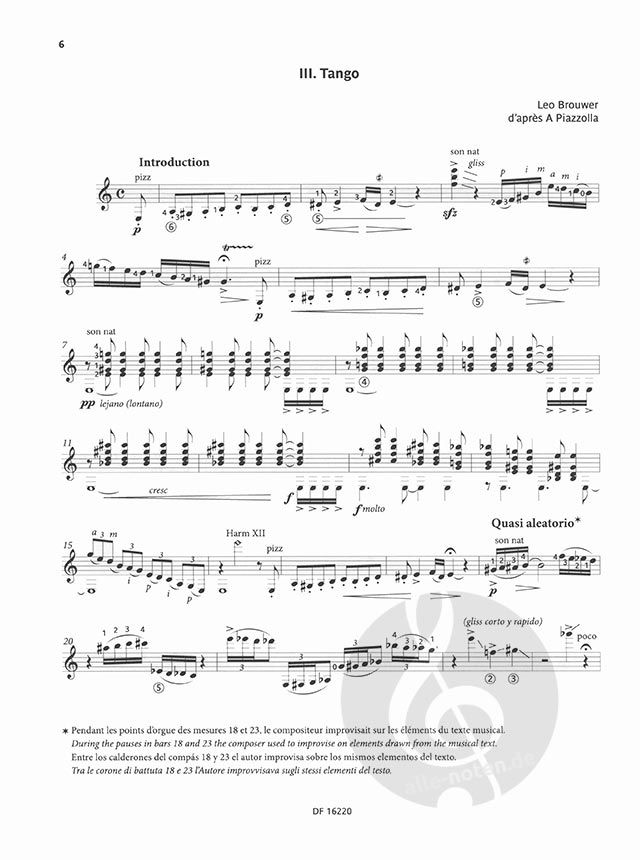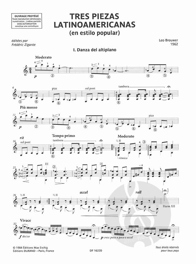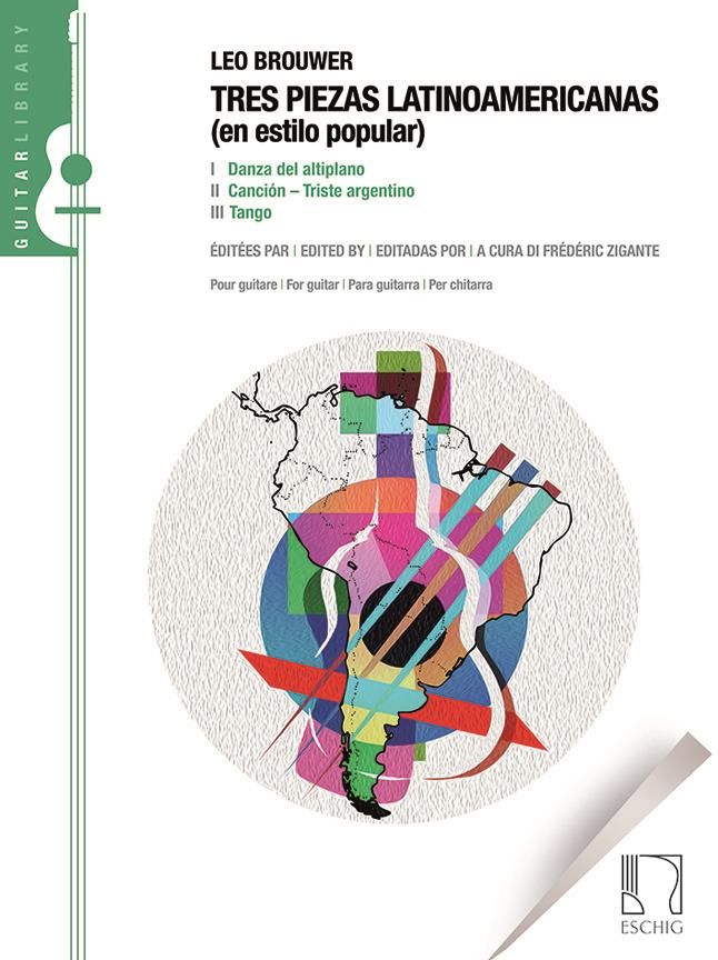 Written in 1962 by a brilliantly imaginative Leo Brouwer at the age of only twenty-three, the Tres piezas latinoamericanas are published here together for the first time under the Eschig imprint in an edition based on the composer's autographmanuscripts. The Tres piezas belong to a musical genre between actual composition and arrangement; they represent in fact one of the rare instances in which Leo Brouwer drew his inspiration from pre-existing themes taken from Andean and Argentinian folktunes or from the work of other composers, such as Carlos Guastavino and Astor Piazzolla. French, English, Spanish and Italian texts.