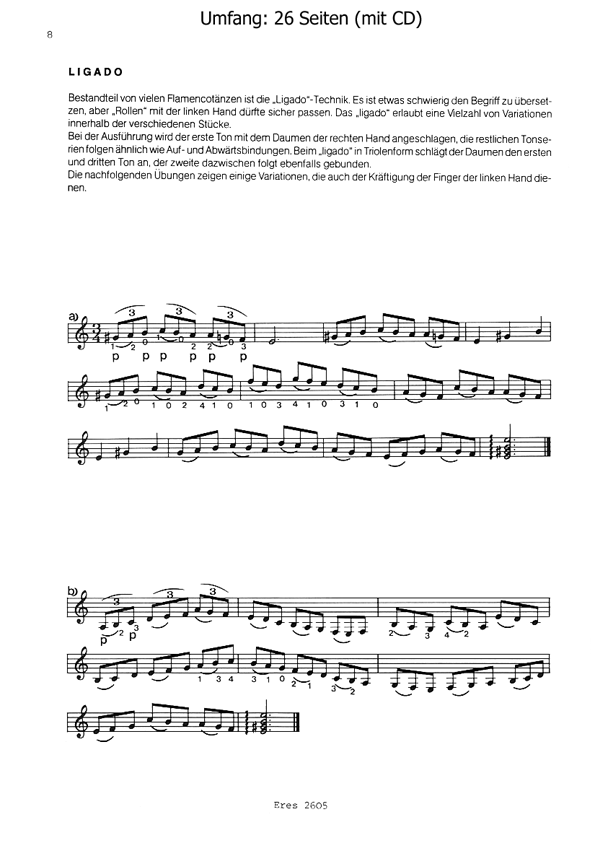 Zum leichten Erlernen der Flamencospielweise. Die Ausgabe ist mit einer CD ausgestattet und enthält zusätzlich fünf Vortragsstücke.Klingende Beispiele auf der beiliegenden CD1. Spanischer Wein (Alegrias)2. Spaziergang in Cordoba (Soleares)3 .Fiesta in Malaga (Malagueñas)4. Adios, Andalucia (Farruca)5. Tanzen und singen (Zapadeado) Flamencotechnik:RasgueadosPicadoLigadoTremoloArpegiosGolpeRumbaAlzapuaDie Spielstücke: 2, 4 und 5 hören Sie neben einigen Beispielen der Spieltechnik auf der beiliegenden CD.Georg Rist hat einen ausgezeichneten Namen als Flamenco-Spezialist. Wir verweisen in diesem Zusammenhang auf die bei Eres erschienenen 'Vier Flamencotänze'.