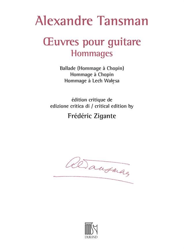 This is the initial volume of Alexandre Tansman's works for guitar in a new critical edition by Frédéric Zigante, consisting of the Polish composer's musical homages to two historically important and influential compatriots: the composer Fryderyk Chopin and union leader Lech Wałesa. This edition is based on a detailed analysis of all of the available autograph manuscripts and a reconstruction of the sources and decisions involved in the original publications, providing informed solutions for many of the open questions generated by these earlier editions.