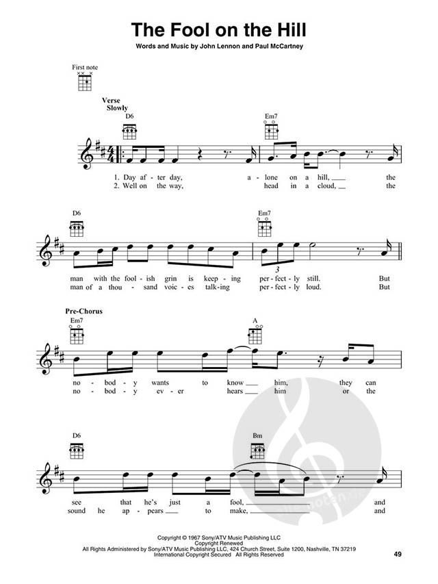 The First 50 Songs by the Beatles You Should Play on Ukulele' is a simply arranged, must-know collection of the Fab Four's greatest hits. Each arrangement includes melody, lyrcs and chord diagrams for standard G-C-E-A uke tuning. Songs include: Across the Universe - Blackbird - Can't Buy Me Love - Day Tripper - Eleanor Rigby - The Fool on the Hill - Good Day Sunshine - Hey Jude - I Want to Hold Your Hand - Let It Be - Michelle - Ob-La-Di, Ob-La-Da - Penny Lane - Sgt. Pepper's Lonely Hearts Club Band - Twist and Shout - We Can Work It Out - Yesterday - and more.