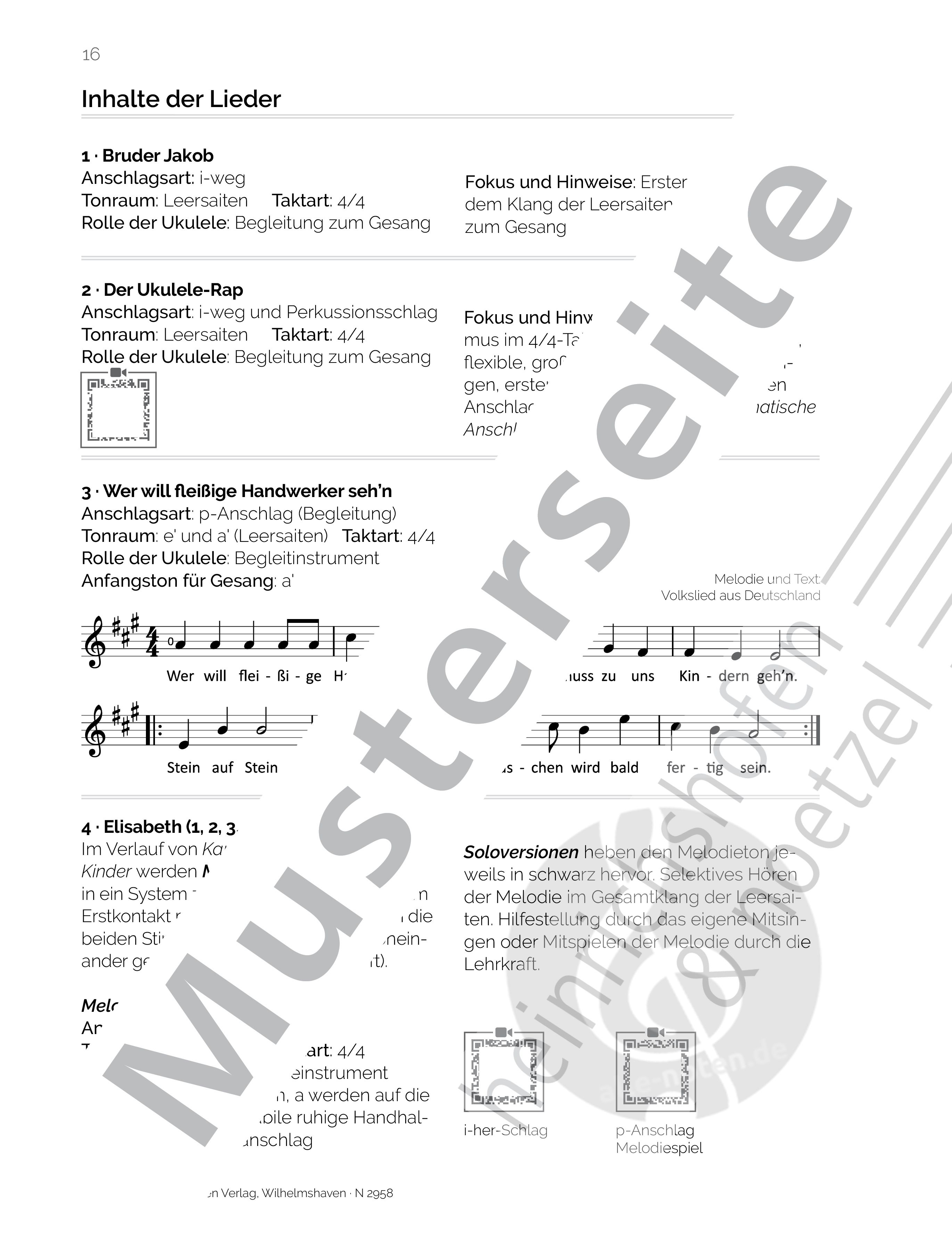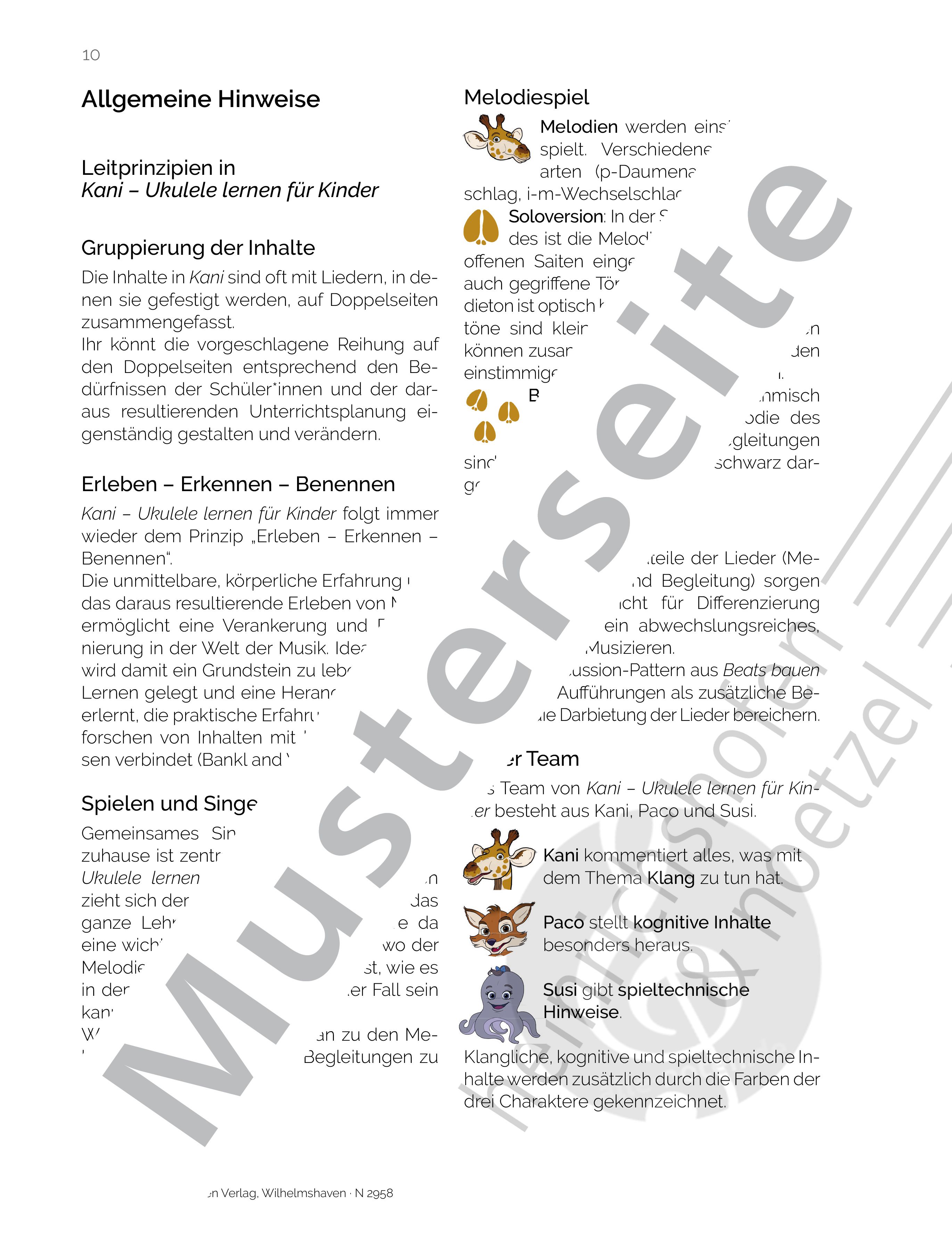 Der "Leitfaden für Lehrkräfte" zu "Kani – Ukulele lernen für Kinder" enthält wichtige Informationen zur Geschichte der Ukulele sowie zu bedeutenden Ukulelist*innen und gibt Einblicke in verschiedene Instrumenttypen und -stimmungen. Zahlreiche idiomatische Anschlagstechniken werden detailliert erklärt und durch Videos veranschaulicht. Jedes Lied aus "Kani" wird ausführlich behandelt, mit einem klaren Fokus und begleitenden Schlagmustern.