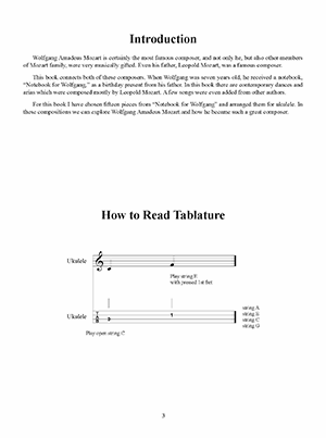 While many are familiar with the music of Wolfgang Amadeus Mozart, fewer are aware that his father, Leopold Mozart, was a famous composer in his own right. At the age of seven, Wolfgang received a notebook from his father as a birthday gift. The 'Notebook for Wolfgang' includes contemporary dances and arias, mostly by Leopold Mozart. These compositions provide a glimpse into the formative years of Wolfgang Amadeus Mozart. This book includes fifteen pieces from the notebook arranged for the Ukulele. The melody and bass parts are arranged so the original notation and polyphony are maintained. Each chapter includes pieces presented in standard notation and tablature.