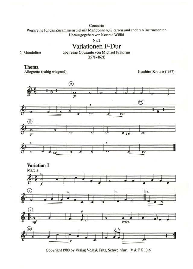 Stets ist das Thema deutlich erkennbar. Die teils traditionellen, teils modernen Variationen erscheinen in unterschiedlichen Tempi und sind teils orchestral, teils kammermusikalisch angelegt. Sehr abwechslungsreich! Leicht bis mittelschwer spielbar, gelegentliches Lagenspiel in M1, Gitarre Akkord- und Melodiespiel. 7'. (Hrsg.: Wölki).
