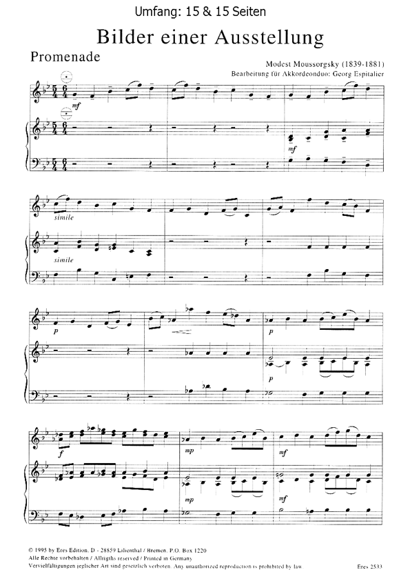 Acht ausgewählte Sätze der berühmten Komposition von M. Mussorgski in einer Bearbeitung für Akkordeon-Duo von G. Espitalier