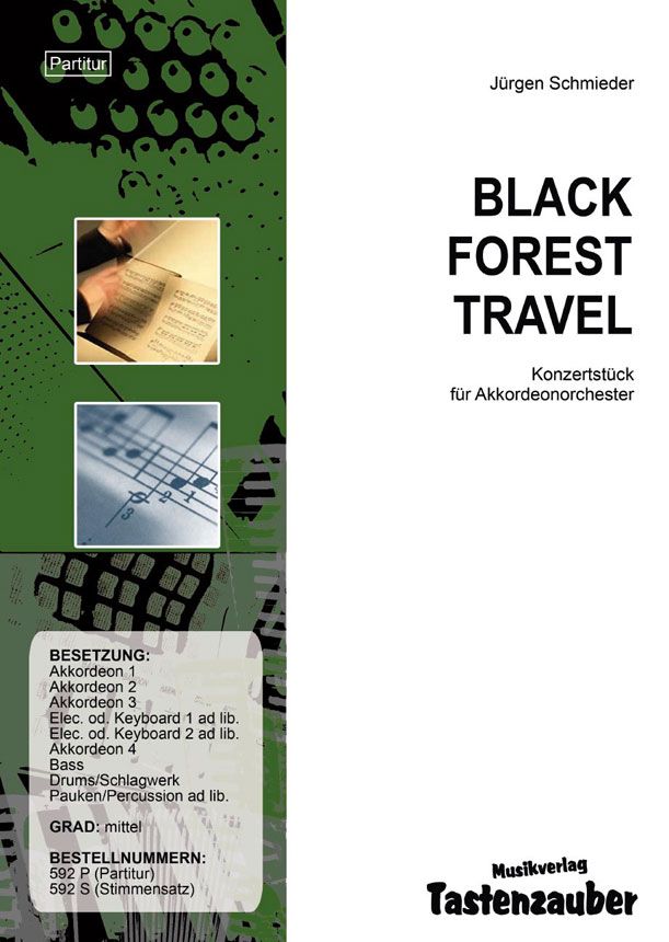 Black Forest Travel ist ein spannendes und abwechslungsreiches Konzertstück für Akkordeonorchester. Der Komponist nimmt die Zuhörer mit auf eine abenteuerliche Reise durch den Schwarzwald. Das groß angelegte Anfangsthema 'Panorama view' beschreibt musikalisch den fantastischen Blick von einem Aussichtspunkt über die dunklen Wälder, die tiefen Schluchten und die weiten Täler des Schwarzwalds. Die Reise geht beim 'Wildwater rafting adventure' weiter - einer rasanten Fahrt durch den Wildwasserbach. Viel Geschick und Ausdauer sind nötig, damit die Stromschnellen das Kanu nicht zum kentern bringen. Schließlich kommen aber alle heil hinunter ins ruhigere Fahrwasser. Nach diesem wilden Ritt ist erstmal etwas Entspannung angesagt - Sightseeing steht auf dem Programm. Dabei darf ein Besuch im Uhrenmuseum mit den berühmten, handgeschnitzten Schwarzwälder Kuckucksuhren, sowie die Besichtigung einer alten Mühle nicht fehlen ('Cuckoo clocks and mills'). Aber genug entspannt - das nächste Abenteuer wartet schon! 'Climbing on steep rocks' nimmt die Zuhörer mit auf eine Klettertour über steile Felsen und tiefe Abhänge in schroffer Berglandschaft. Doch Vorsicht! - nicht abstürzen, denn die Kletterroute birgt einige Gefahren. An einem romantisch gelegenen Bergsee ('Romantic lake') wird es Zeit für eine Rast in idyllischer Natur. Noch ein letzter Blick ins Tal ('Last view down into the valley'), bevor man die Heimreise antritt. Spannende und gute Unterhaltung mit 'Black Forest Travel' von Jürgen Schmieder.