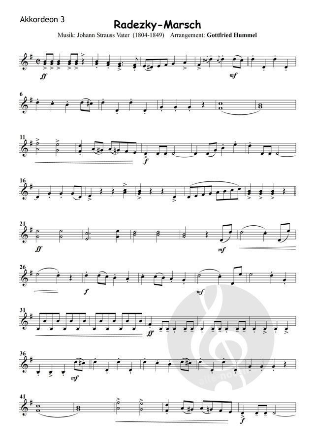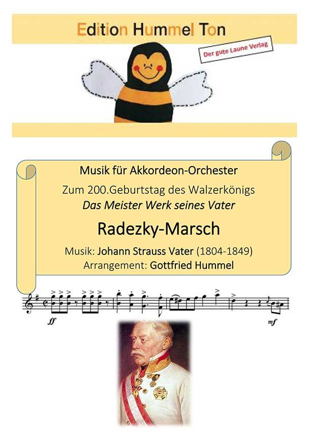 Zum Abschluß des Johann Strauss Jahres wird nun noch ein anderer Johann Strauss in die Johann Strauss Kollektion der Edition Hummel Ton aufgenommen - nämlich "Schani´s" Papa. Er schrieb mit die berühmtesten 4 Takte der Welt, mit denen sein Meisterwerk, der Radezky-Marsch eingeleitet wird. Der Marsch krönt das Finale jedes Neujahrskonzertes und wird auch sicher ihr persönliches Konzertprogramm bereichern. Hier im Arrangement für Akkordeonorchester mit Easy Stimmen.