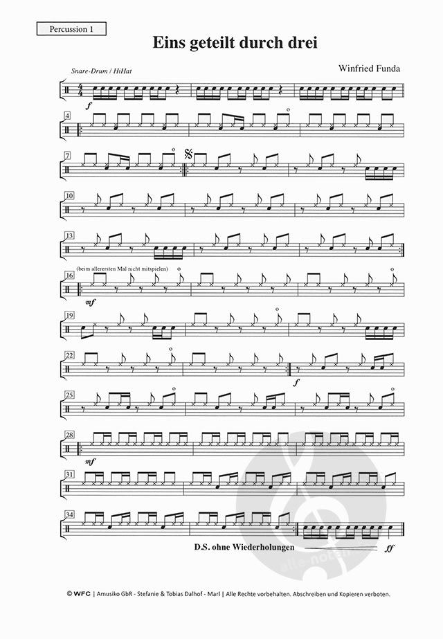 Eins geteilt durch Drei für Schlagzeug-Trio von Winfried Funda Drei Spieler teilen sich ein Schlagzeug. Jeder benötigt zusätzlich einen Hocker und ein Notenpult. Sinnvoll ist auch eine Doppelfußmaschine, dann kann das Stück fetziger gespielt werden. Spieler eins übernimmt Snare-Drum und Hi-Hat. Spieler zwei bekommt drei Tom-Toms und das Ride-Becken. Spieler drei spielt auf der Bass-Drum und dem Crash-Becken.