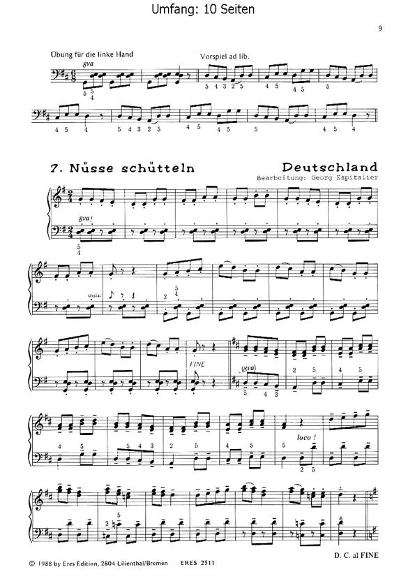 Für Freebass-Akkordeon (Melodiebass).Inhalt:1. Ridée de St.Jean (Frankreich)2. Lou Panliran (Frankreich)3. Branle de Quercy (Frankreich)4. Sur le pont d'Avignon (Frankreich)5. Goos up de Deel (Norddeutschland)6. Kuckuck und Esel (Deutschland)7. Nüsse schütteln (Masuren/Deutschland)8. Kaperfahrt (Belgien)9. Wohin gehst du, kleiner Hase? (Ungarn)10. Con spirito (Ungarn)11. Espressivo (Ungarn)12. Pandura (Ungarn)13. Blue Jack (Großbritannien)14. Langer Tag (Schweden)Aus den 14 kleinen Stücken können auch Suiten zusammen gestellt werden. Der Schwierigkeitsgrad reicht von leicht bis mittelschwer.Kurze Vorübungen bzw. Vorspiele für das linke Manual sind den ersten sieben Stücken voran gestellt.