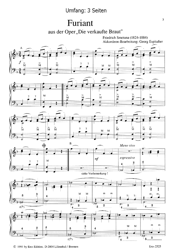 Ähnlich wie die 'Zwiefachen' in Niederbayern ist der böhmische 'Furiant' ein Volkstanz, in den 2/4-Takte und 3/4-Takte miteinander abwechseln, ohne das dafür gleichbleibende Muster gelten. Man sagt, das seien Stücke gewesen, mit denen die Musikanten ihre Tänzer verulkten und durcheinander brachten, bis diese wiederum lernten, sich auf die Melodien einzustellen. Aufführungspraktische Hinweise in der Notenausgabe.Ausgabe der Serie 'Folkloristische Klassik - klassische Folklore', Arrangement: G. Espitalier