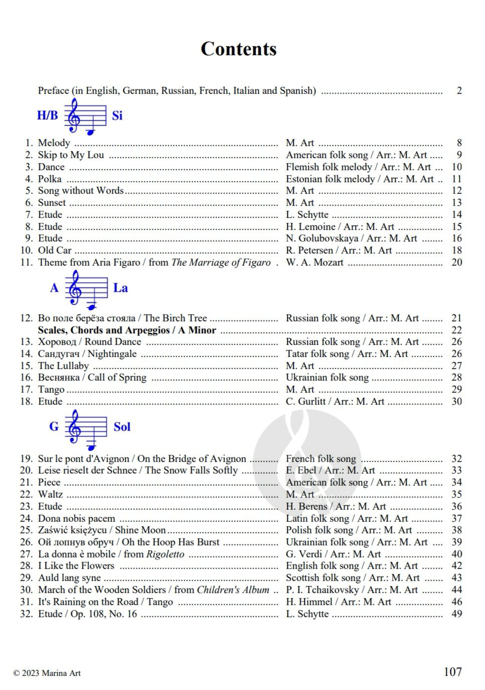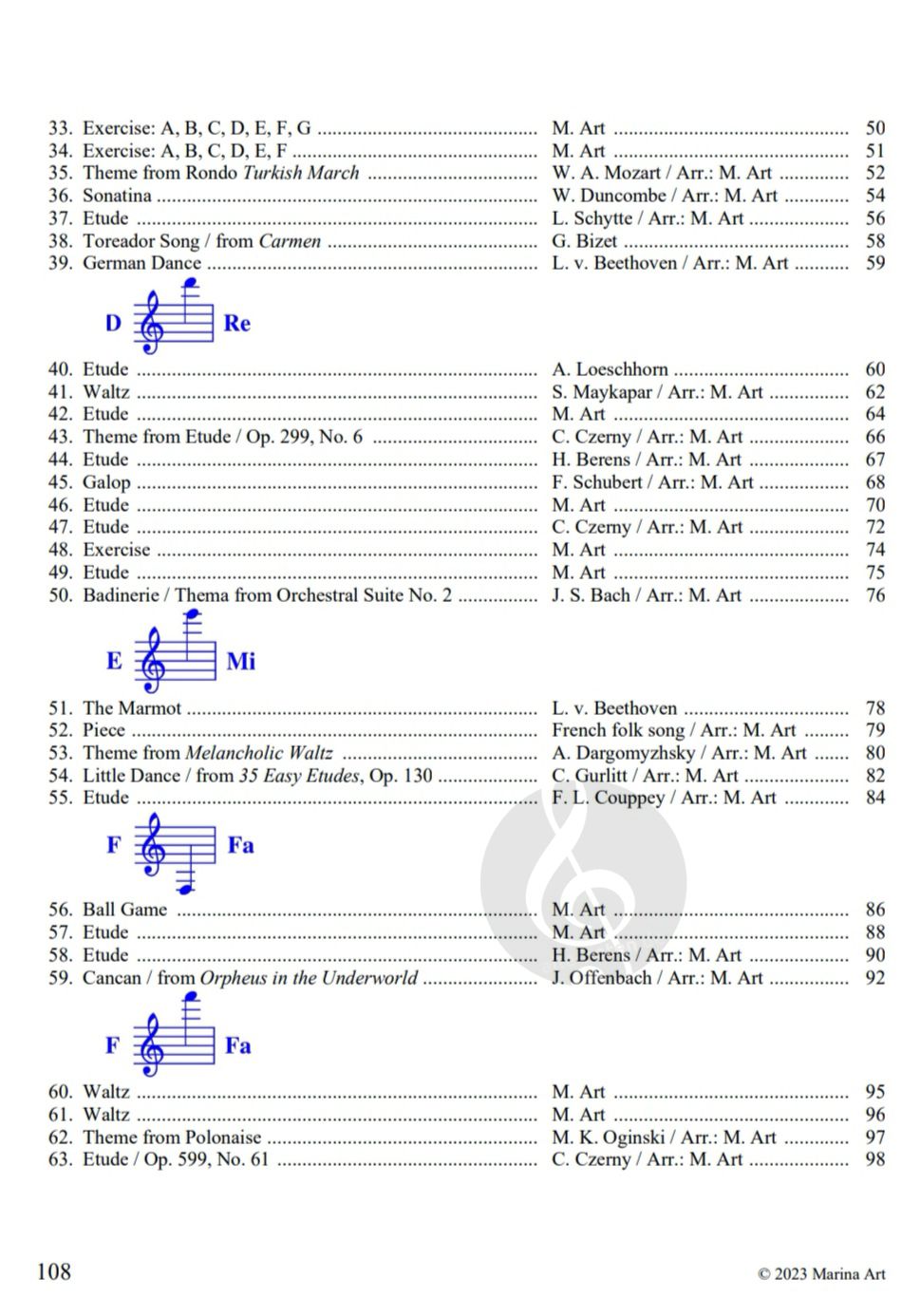 Die Buchreihe Noten lernen Schritt für Schritt besteht aus sieben Bänden, die den Farben des Regenbogens entsprechen. Das musikalische Repertoire ist äußerst abwechslungsreich. Das musikalische Repertoire ist äußerst abwechslungsreich. Es enthält Volkslieder, von der Autorin komponierte und bearbeitete Werke sowie Musikstücke von berühmten Komponisten wie Bach, Mozart, Beethoven, Chopin und anderen.