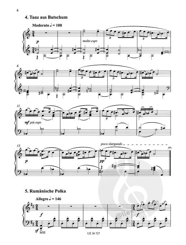 > Sechs kurze Sätze, die Volksmelodien in Bartóks eigener Harmonisierung enthalten und eine breite Stimmungsskala umspannen
