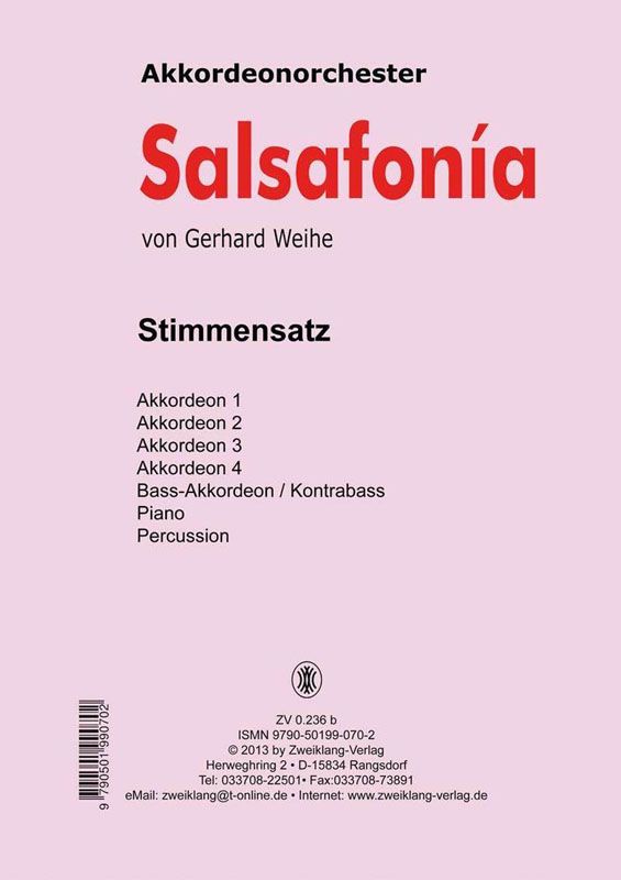 Das Akkordeon ist kein klassisches Salsa-Instrument, aber durch die Verschmelzung von Traditionellem mit folkloristischen Einflüssen in Kuba fand das Akkordeon schon früh Eingang in die Salsa-Musik. Salsafonía nutzt das Akkordeon in seinen unterschiedlichen Fassetten. Der Rhythmus des rahmengebenden tänzerischen Teils ist vom Montuno, dem kubanischen Klavierstil geprägt. Der kontrastierende Mittelteil stellt mit seinen ruhigen Akkordfortschreitungen eine Hommage auf das namensgebende griechische Wort ‚euphonia', dt. Wohlklang dar. Salsafonía wurde am 18. Januar 2014 in der Heilig-Kreuz-Kirche und in der Philharmonie in Berlin am 25. Juni 2014 erfolgreich aufgeführt.