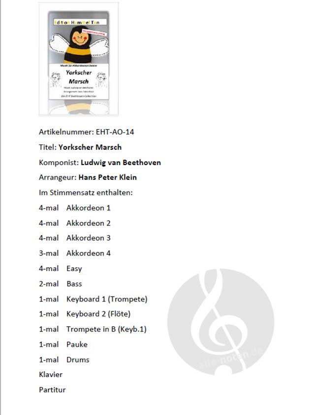 Der Marsch Nr. 1 in F-Dur (WoO 18) von Ludwig van Beethoven, bekannt als Yorckscher Marsch oder Marsch des Yorckschen Korps (Armeemarsch II, 103; Armeemarsch II, 37; Heeresmarsch II, 5), ist einer der berühmtesten deutschen Militärmärsche. 1813 wurde der Marsch zu Ehren des preußischen Generals Ludwig Yorck von Wartenburg benannt. Hier liegt er nun in einer Fassung für Akkordeon-Orchester vor.