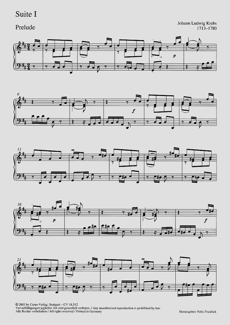 Der Bachschüler Johann Ludwig Krebs war 1746, als seine Sechs Suiten als 4. Teil seiner Clavier-Übung beim Nürnberger Verleger Haffner erschienen, Schlossorganist in Zeitz (Herzogtum Sachsen-Zeitz). Die Suiten, die stilistisch bereits der Vorklassik nahe stehen, umfassen zwischen 6 und 10 Sätze, zu denen auch damals moderne Charakterstücke wie 'Polonoise' und 'Harlequinade' gehören. - Cemb (Pfte, Org)