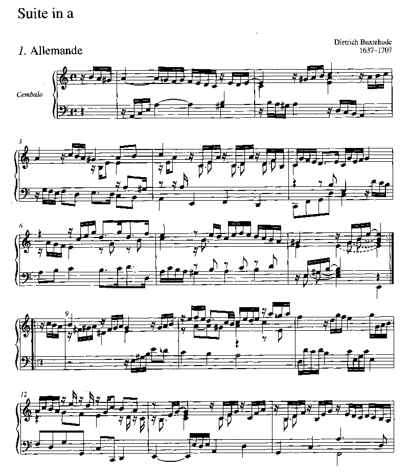 Einzige Quelle für die Suite in a ist der 1704 in Breitenberg bei Itzehoe entstandene Teil einer Sammelhandschrift des Organisten Johann Kruse. Aufgrund der Autorenangabe 'D.B.H.', die in entsprechender Weise auch bei Stücken anderer Komponisten vorgenommen worden ist und sich bestätigt hat, ist es naheliegend, das Werk Dieterich Buxtehude zuzuweisen, zumal Kruse in Hamburg aller Wahrscheinlichkeit nach auch Kontakt zu ihm hatte. Unter den Buxtehude zugeschriebenen Cembalosuiten steht die hier erstmals veröffentlichte wegen der Kürze ihrer vier Sätze den ihr zugrundeliegenden Tanz-Grundmustern am nächsten - ein klein dimensioniertes, aber kunstvolles Werk.