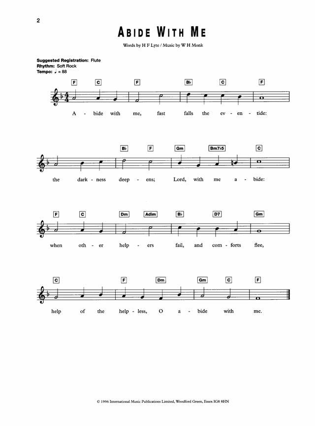A collection of favourite Hymns arranged for easy Keyboard. Each hymn features melody line, vocals, chord displays, suggested registrations and rhythm settings. Includes 'Abide With Me', 'All Things B...