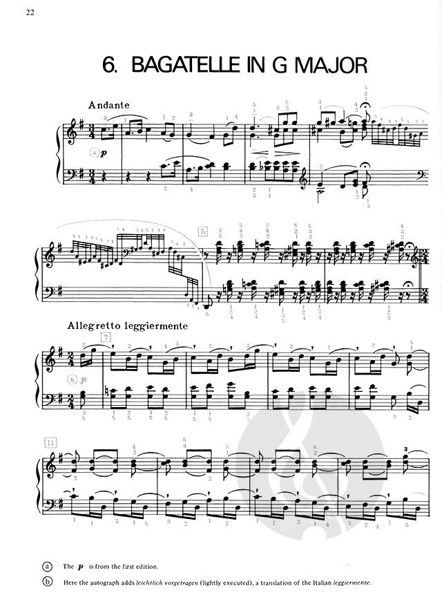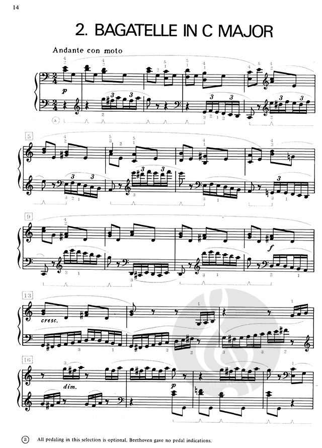 Beethoven valued these pieces highly and wrote in a letter to his pupil Ferdinand Ries that the first six pieces belonged together and the last five together. Editor Willard A. Palmer provides excellent background information on Beethoven and the origin of the 'Bagatelles. ' Based on his careful study of Beethoven's letters and other historical references, Palmer gives pianists detailed performance tips on the use of legato, staccato, the slur, ornamentation, pedaling and rubato. Editorial fingerings and articulation are printed in light gray to distinguish them from those found in Beethoven's original manuscripts making this Alfred edition especially suitable for students and teachers alike.