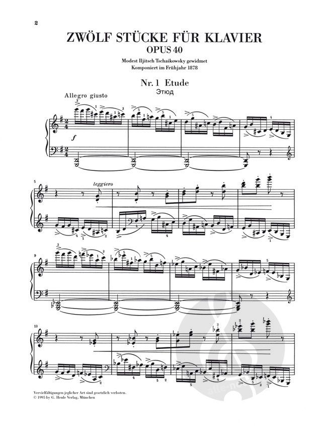 Zwar hatte Peter Tschaikowsky Anfang 1878 gerade seine Oper 'Eugen Onegin' sowie seine 4. Sinfonie auf den Weg gebracht, aber an eine schöpferische Pause war nicht zu denken. Vielmehr griff er gleich wieder zum Schreibzeug und komponierte die 'Zwölf Stücke' op. 40 für Klavier, die verschiedene Genres aufgreifen. Der Zyklus enthält einerseits Typisches für die Klaviermusik jener Epoche wie Etüden, Walzer und Mazurken. Dazu gesellen sich auch Stücke, die vermutlich mit der Biographie Tschaikowskys verknüpft sind und Titel tragen wie 'Au village', 'Marche funèbre' oder 'Rêverie interrompue'. Für diese Urtextausgabe konnte neben der autographen Stichvorlage im Moskauer Glinka-Museum auch die seltenen russischen Drucke von 1879 und 1890 herangezogen werden, wie im Vorwort ausführlich dargestellt wird.