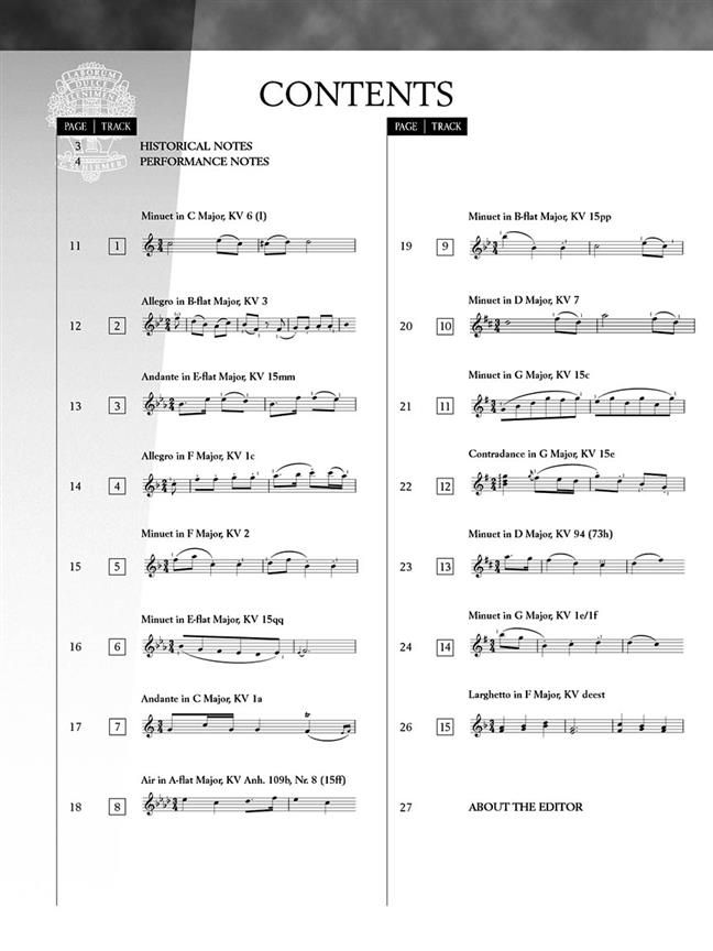 This collection of remarkable jewels by Mozart will be invaluable to teachers and students. The book features some of Mozart's earliest works, a few of which were composed when the young Wolfgang was only six years old. Already present are signs of remarkable taste and talent: beautiful melody, impeccable formal construction, and unsurpassed elegance. These pieces are wonderful tools for teaching articulation, independence of the hands, and the classical style. Recordings of this literature are difficult to locate so this pack includes a beautifully refined recording by the editor. Contents: Air in A-flat major (KV Anh. 109b Nr. 8 [15ff]) - Allegro in B-flat major (KV 3) - Allegro in F major (KV 1c) - Andante in C major (KV 1a) - Andante in E-flat major (KV 15mm) - Contradance in G major (KV 15e) - Larghetto in F major - Minuet in B-flat major (KV 15pp) - Minuet in C major (from KV 6) - Minuet in D major (KV 7) - Minuet in D major (KV 94 [73h]) - Minuet in E-flat major (KV 15qq) - Minuet in F major (KV 2) - Minuet in G major (KV 1e/1f) - Minuet in G major (KV 15c) - Minuet in G major (KV 15y)