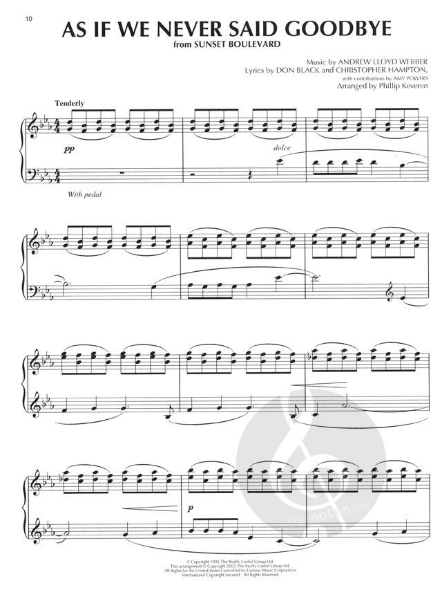 This fabulous collection contains Phillip Keveren's graceful, artistic solo piano arrangements of 18 songs from Webber blockbusters.