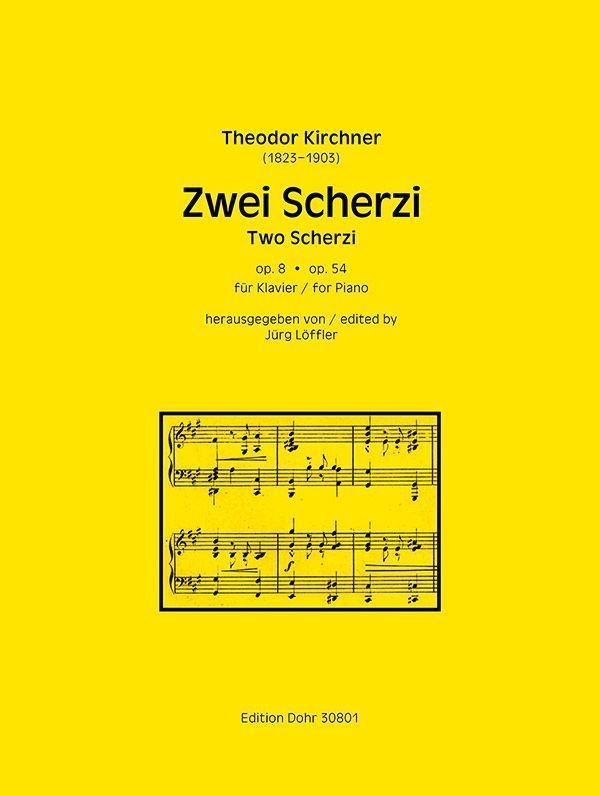 Die beiden hier vorliegenden Scherzi entstanden im Abstand von etwa 30 Jahren. Das Scherzo op. 8 erschien 1857 bei Rieter-Biedermann in Winterthur, ist zumindest in Teilen aber wohl schön früher entstanden. Das 2. Scherzo op. 54 erschien 1881 im Verlag Friedrich Hofmeister in Leipzig, stammt also aus Kirchners überaus produktiven Zeit in Leipzig. Vergleicht man die beiden Werke, so merkt man dem später entstandenen Opus 54 zwar die virtuosere Handhabung des Klaviersatzes an; stilistisch hat sich aber in den 30 Jahren nur wenig geändert.